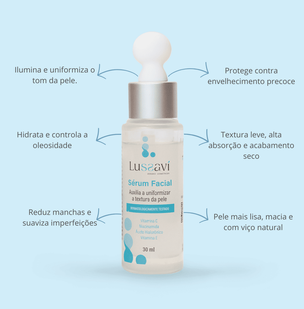 O sérum combina ativos que ajudam a iluminar a pele, reduzir sinais de envelhecimento, uniformizar o tom, hidratar profundamente e melhorar a textura da pele. A Vitamina C nanoencapsulada maximiza a absorção e eficácia, enquanto a Vitamina E e a Niacinamida oferecem proteção antioxidante e anti-inflamatória. O Ácido Hialurônico hidrata intensamente e preenche linhas finas.